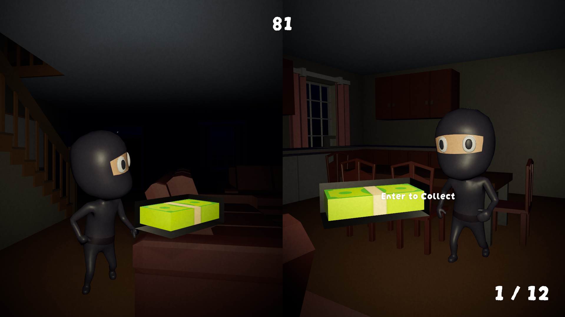 ROBBED is a game about 2 thieves stealing money from a house, one is lock picking expert and another have to take the money. They'll have to collect every money in that house within 2 minutes before the police arrive.